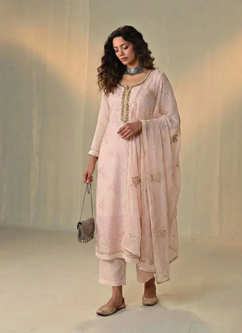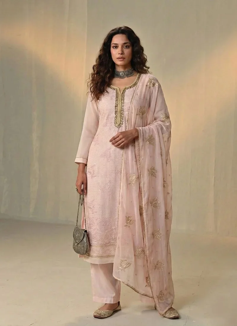 This peach georgette salwar kameez is crafted for women who appreciate refined ethnic fashion.