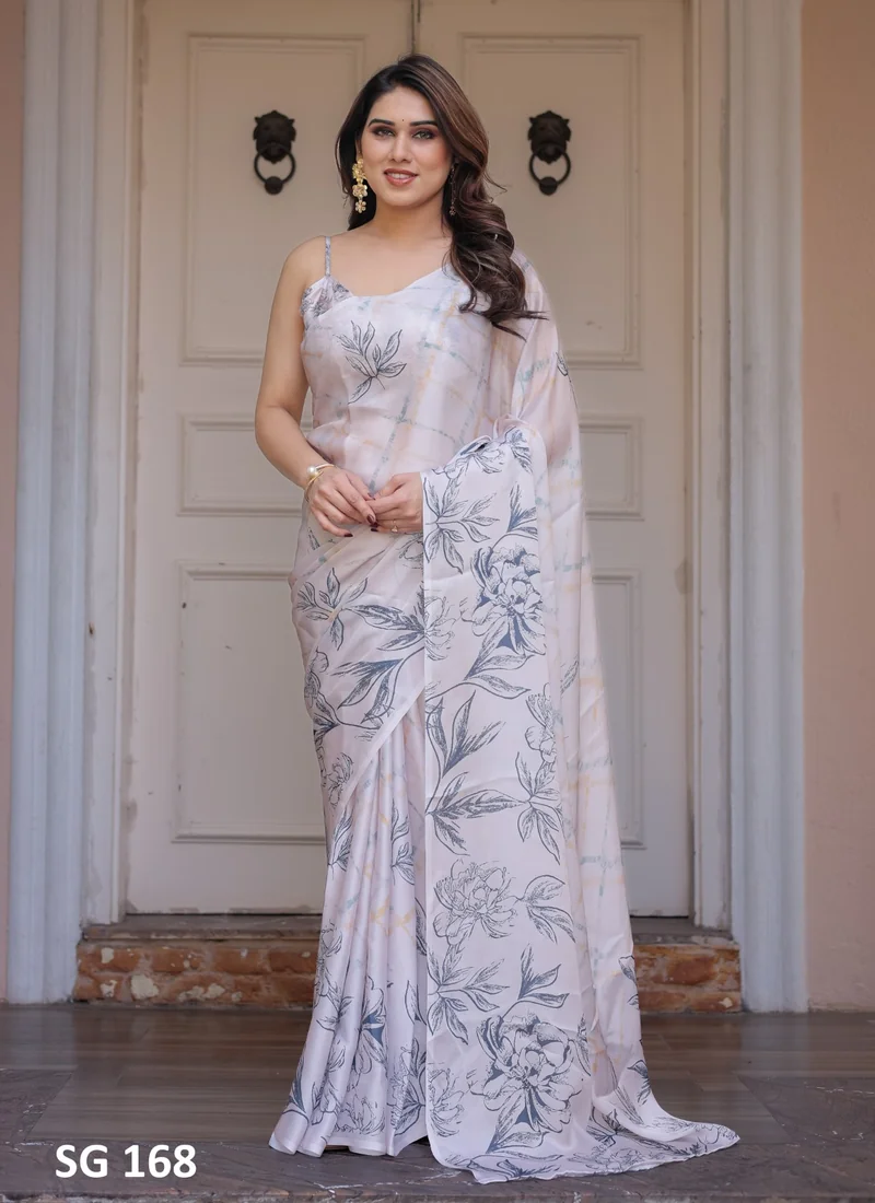 Step into timeless tradition with this beautifully designed created with elegance in mind. This grey saree features elegant printed work that ideal for women who love ethnic fashion. premium quality sattin georgette ensures durability.
