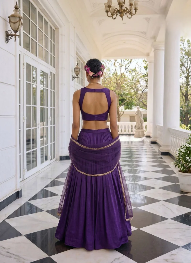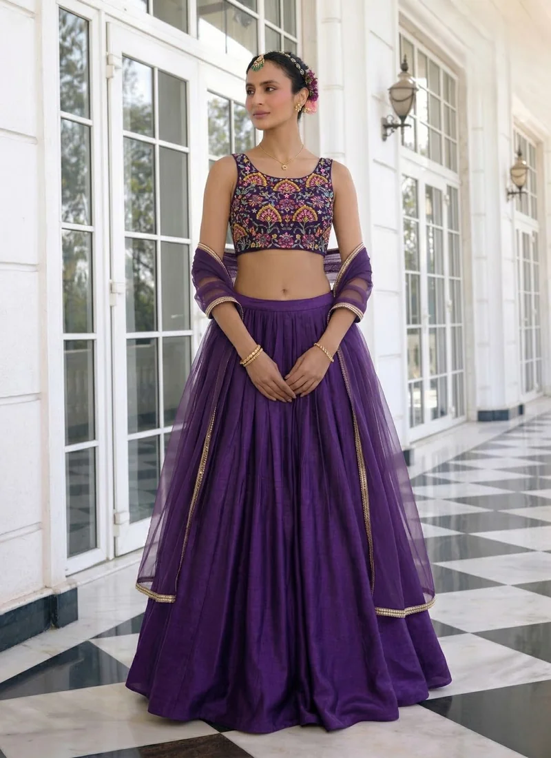 Step into traditional elegance with this premium lehenga. This purple lehenga choli features embroidered work that designed for a luxurious ethnic look. luxurious vichitra silk fabric ensures comfort.